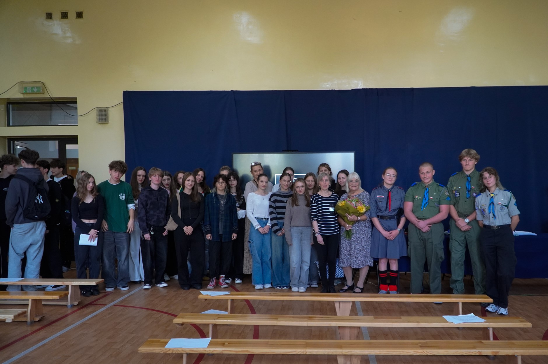 W dniu 23 października 2025 roku odbyło się w XXV Liceum Ogólnokształcącym spotkanie z p. Krystyną Woźniak, autorką, wydanego z okazji 80 rocznicy wybuchu Powstania Warszawskiego, tomiku poezji “Niebo pękało sierpniem”. Z tej okazji grupa 150 uczniów naszej szkoły - głównie z klas humanistycznych - mogła obejrzeć program poetycko-muzyczny. Podczas spotkania zaprezentowane były wiersze w tomiku w wykonaniu p. Krystyny Woźniak i p. Marzeny Szumlańskiej - Śron, wzbogacone oprawą muzyczną - p. Czesław Ganda, p. Stanisław Dobrzański, p. Jacek Kostyszak. Do udziału w programie zaproszono także uczniów, którzy wykonywali wspólnie z występującymi niektóre piosenki. Interesującym elementem były również zaprezentowane na telebimie zdjęcia z archiwum Muzeum Powstania Warszawskiego.